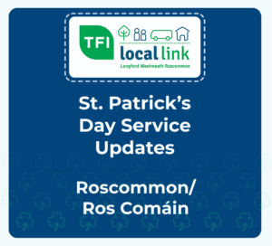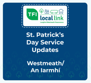 Please note that a Sunday timetable will operate on St Patrick’s Day (Tuesday, 17th March) across TFI Local Link Longford Westmeath Roscommon services. Due to parades and road closures, some services may also experience delays.